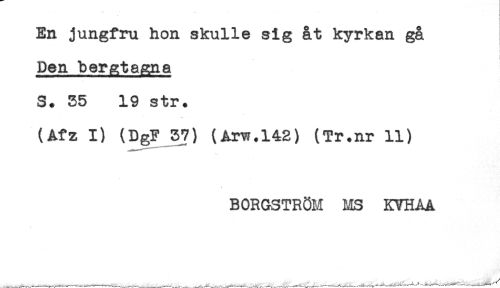 //// En jungfru hon skulle sig åt kyrkan gå //// Den bergtagna //// S. 35 19 str. //// (Afz I) (DgF 37) (Arw.142) (Tr.nr 11) //// BORGSTRÖM MS KVHAA ////