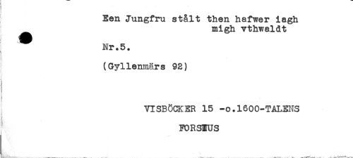 //// Eea Jungfru stålt then hafwer iagh //// migh vthwaldt //// Nr.5. //// (Gyllenmärs 92) //// ) //// VISBÖCKER 15 -O.1600-TALENS //// . //// - //// F0RS3KJS //// IL. .____....._____. -i-.-. ^ - _,. , ////