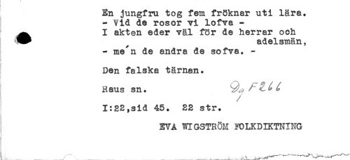 //// En jungfru tog fem fröknar uti lära. //// - Vid de rosor vi lofva - //// ^^ I akten eder väl för de herrar och //// (H^ adelsmän, //// - me^n de andra de sofva. - //// i //// Den falska tärnan. //// Raus sn. ^ ' ^ //// 1:22,sid 45. 22 str. //// EVA WIGSTRÖM FOLKDIKTNING ////