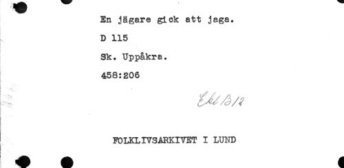 //// En jägare gick att jaga. //// * //// D 115 //// Sk. Uppåkra. //// 458:206 //// ** ^ //// FOLKLIVS ARKIVET I LUND ////