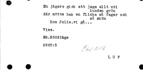 //// En jägare gick att jaga allt uti //// lunden grön //// där mötte han en flicka så fager och //// så skön //// Kom Julia,vi gå.*. //// Visa. //// Sk.Röddihge //// ' - //// 2695:3 ^ //// L u ? //// if. . //// l ////