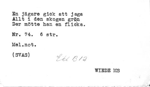 //// En jägare gick att jaga //// Allt i den skogen gr{^n //// Der mötte han en flicka. //// Nr. 74. 6 str. //// Mel.not. //// 'SVAS' '„'. //// WIEDE MS //// ? ////