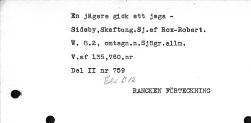 //// En jägare gick att jaga - //// Sideby,Skaftung.3j * af Rox-Robert. //// W. 8.2, omtagn.n.SjSgr.allm. //// V.af 135,760.nr //// Del II nr 759 //// ^ RANCKEN FÖRTECKNING //// } ////