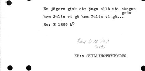 //// En jägare givk att Raga allt uti skogen //// grön //// kom Julia vi gå kom Julia vi gå... //// Se: E 1899 k^ //// ^ ' //// KB:s SKILLINGTRYCKSREG ////