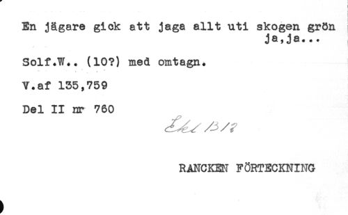 //// ! //// < //// En jägare gick att jaga allt uti skogen grön //// ja,ja*** i //// Solf.W*. (10?) med omtagn. //// ... . * //// * * //// V.af 155,759 //// Del II nr 760 //// RANCKEN FÖRTECKNING ////
