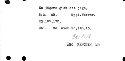 //// En jägare gick att jaga, //// 8:2. SB. Uppt.Wefvar. //// R3,165,172. //// . //// Mel. Mel.även R6,195,10. //// ÅBO RANCKEN MS ////
