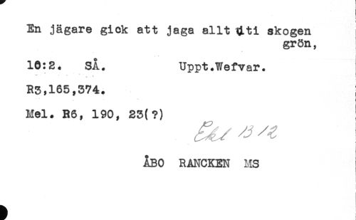 //// En jägare gick att jaga allt g.ti skogen //// grön, //// 10:2. SÅ. Uppt.Wefvar. //// R3,165,374. //// Mel. R6, 190, 23(?) ! //// i //// ÅBO RANCKEN MS ////