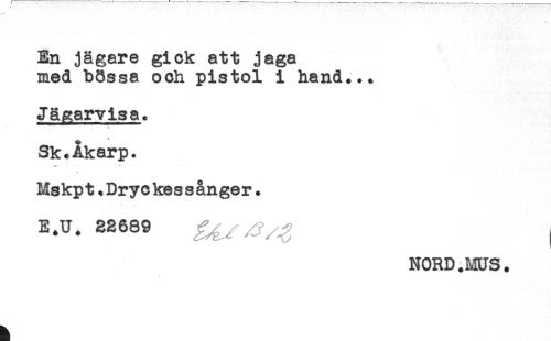 //// En jägare gick att jaga //// med bössa och pistol i hand... //// Jägarvisa. //// Sk.Åkarp. //// -' -S- - ^ //// Ms kp t.Dryc kes s ån ger. //// E.U. 32689 j //// NORD.MUS. ////