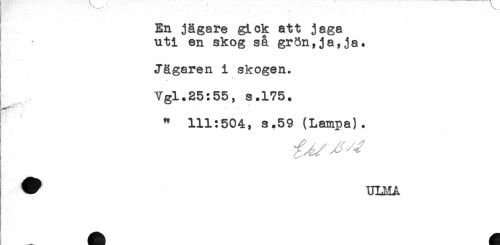 //// j - . . //// En jägare gick att jaga //// uti en skog så grön,ja,ja. //// t //// j //// Jägaren i skogen. //// å *** *** ___ //// Vgl.25:55, s.175. //// " 111:504, s.59 (Lampa). //// { //// W ULMA ////