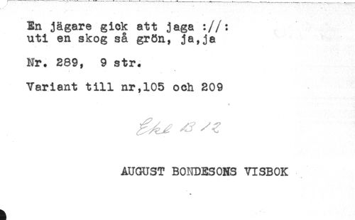 //// En jägare gick att jaga ://: //// uti en skog så grön, ja,ja //// Nr. 289, 9 str. //// Variant till nr,105 och 209 //// W //// AUGUST BONDESONS VISBOK ////