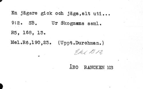 //// En jägare gick och jäga,alt uti... //// 9:2. SB. Ur Skogmans saml. //// R5, 168, 13. //// Mel.R6,190,23. (Uppt.Durchman.) //// ÅBO RANCKEN LS ////