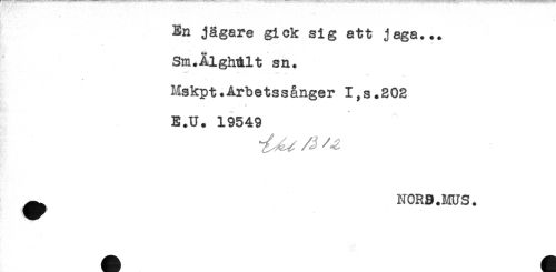 //// En jägare gick sig att jaga... //// t . //// * //// Sm.Ålghllt sn. //// , *-- - ... //// Mskpt.Arbetssånger I,s.202 //// E.U. 19549 ////