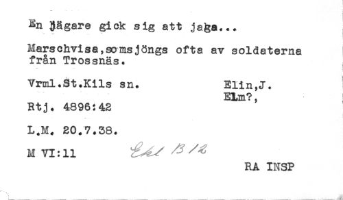 //// En $ägare gick sig att ja&a... //// <*-* -- ^. " //// Marschvisa, so msjöngs ofta av soldaterna //// från Trossnäs. //// Vrml.St.Kils sn. Elin,J. //// Elm?, //// Rtj. 4896:42 //// L.M. 20.7.38. //// M VI:ll ' , V ^ ^ ////