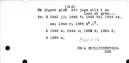 //// -<-" ...... - //// (sig) //// Eh jägare giot stt jaga allt i en //// lund så grön... //// Se: E 1841 jj; 1842 f; 1843 bb; 1844 aa, //// - ^ * * //// ee; 1848 r; 1855 a3,l3, //// > * * //// * //// N 1842 e; 1844 c; 1853 d; 1854 d, //// R 1860 a, ////