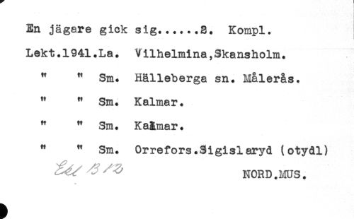 //// Lekt.1941.La. Vilhelmina,Skansholm. //// < //// ' < //// " " Sm. Hälleberga sn. Måler&s. //// " " Sm. Kalmar. //// " "Sm. Kaåmar. //// " " Sm. Orrefors.Sigislaryd (otyål) //// & - *'^ NORD.MUS. ////