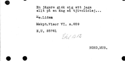 //// En jägare gick sig att jaga //// allt på en äng så tjivoliolej... //// Me.Liden //// <. * - - //// - //// - //// Mskpt.Visor VI. s.659 //// E.U. 25761 ////