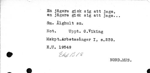 //// *' **** - - . J ^ //// En jägare gick sig att jaga, //// en jägare gick sig att jaga... //// Sm. Ålghult sn. //// Not. Uppt. 0.Viking //// -** //// Mskpt. Arbets sånger I, s.239. //// E.U. 19549 ////