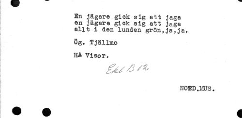 //// En jägare gick sig att jaga //// en jägare gick sig att jaga //// allt i den lunden grön,ja,ja. //// 8g. Tjällmo //// HA Visor. //// NORD.MUS. ////