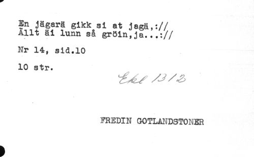 //// En jägarä gikk si at jagä,: //// //Allt äi lunn så gröin,ja...: //// //Nr 14, sid.10 //// 10 str. //// FREDIN OOTLANDSTONER ////