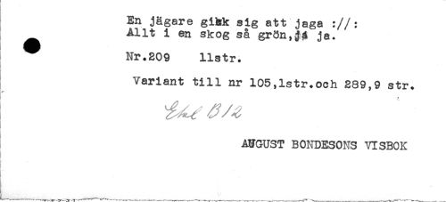 //// En jägare gibk sig att jaga ://: //// Allt i en skog så grön,^ ja. //// Nr.209 llstr. //// ' //// Variant till nr 105,lstr.och 289,9 str. //// AUGUST BONDESONS VISBOK //// r - - . ////