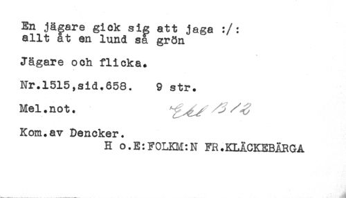 //// En jägare gick sig att jaga :/: //// allt at en lund sa grön //// Jägare och flicka. //// j . //// Nr.1515,sid.658. 9 str. //// Mel.not. ^ //// Kom.av Dencker. //// H o.E:F0LKM:N FR.KLACKEBARGA //// ..... . ____... ^ ////