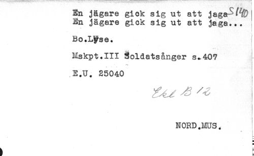 //// En jägare gick sig ut att jaga^-^9] //// En jägare gick sig ut att jaga... //// Bo.Lyse. ! //// . //// < //// i //// Mskpt.III Soldatsånger s.407 ' //// E.U. 25040 //// i //// i //// t //// NORD.MUS. //// * { //// < //// t ' ? ////