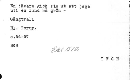 //// / f //// En jägare gick sig ut att jaga ^ //// uti en lund så grön - //// ! //// Gångtrall //// Hl. Torup. - //// t //// i //// s.66-67 ; //// 863 ; //// I F G H I ////