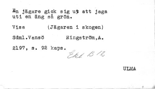 //// ----- I //// i //// En jägare gick sig u^ att jaga //// uti en äng så grön. //// Visa (Jägaren i skogen) //// Sdml.Vansö Ringström,A. //// i //// 2197, s. 92 kaps. //// ULMA //// 1 //// ___f____* ////