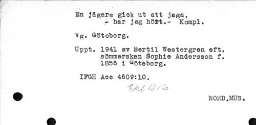 //// K* * //// En jägare gick ut att jaga, //// r har jag höi?t.- Kompl* //// - //// Vg. Göteborg. //// Uppt. 1941 av Bertil Westergren eft. //// sömmerskan Sophie Andersson f. //// 1856 i Göteborg. //// IFGH Acc 4609:10. ////