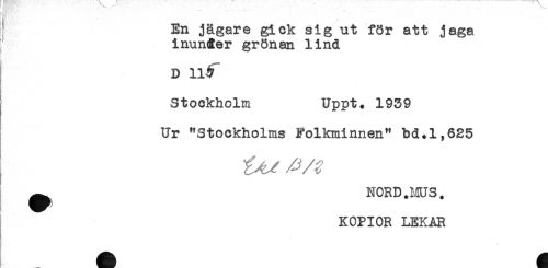 //// En jägare gick sig ut för att jaga //// inundter grönan lind //// D 11^" //// Stockholm Uppt. 1939 //// Ur "Stockholms Folkminnen" bd.1,625 //// A/, //// ^ NORD.HUS. //// KOPIOR LEKAR //// //// /