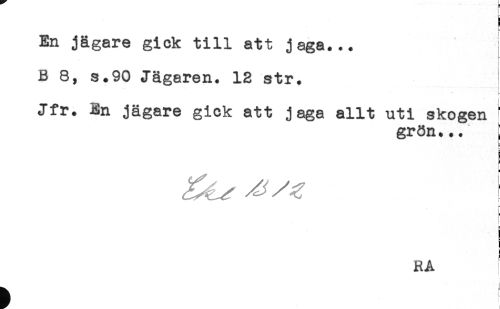 //// j //// t- //// En jägare gick till att jaga... //// B 8, s.90 Jägaren. 12 str. //// --- //// L //// Jfr. En jägare gick att jaga allt uti skogen ^ //// grön... ^ //// E //// c //// t ////