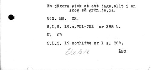 //// En jägare gick ut att jaga,allt i en //// skog så grön,ja,ja. //// ^ 8:2. MU. OR. //// t //// S.L.S. 19.s.751-752 nr 288 b. //// N. OR //// S.L.S. 19 nothäfte nr 1 s. 822. ////
