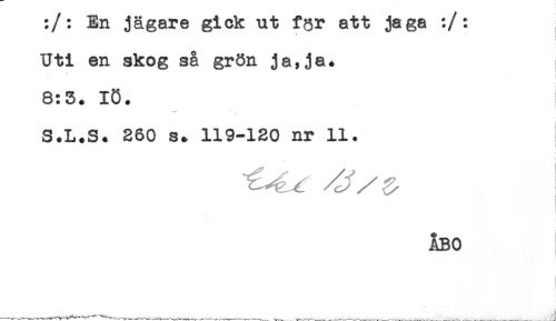 //// :/: En jägare gick ut far att jaga :/: //// * //// Uti en skog så grön ja,ja. //// 8:3. 18. i //// * ^ //// S.L.S. 260 s* 119-120 nr 11. //// i //// r //// ÅBO ////