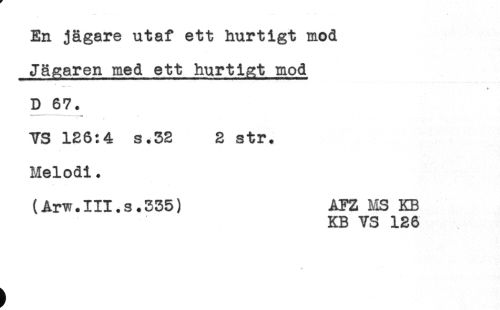 //// Jägaren med ett hurtigt mod //// * //// * //// D 67. //// YS 126:4 s.32 2 str. //// Melodi. //// (Arw.III.s.335) AFZ MS KB //// KB VS 126 ////
