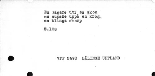 //// -- n- //// - //// En jägare uti en skog //// en supa te uppå en krog, //// en klinga skarp //// 3.108 //// . //// - //// ^ VFF 24=98 BÅL INGE UPPLAND //// <* ////