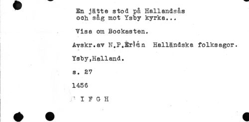 //// En jätte stod på Hallandsås //// och såg mot Ysby kyrka... //// Visa om Bockasten. //// Avskr.av N.P.Értén Halländska folksagor. //// -a - * //// Ysby,Halland. //// s. 27 //// 1456 //// ' I F G H ////