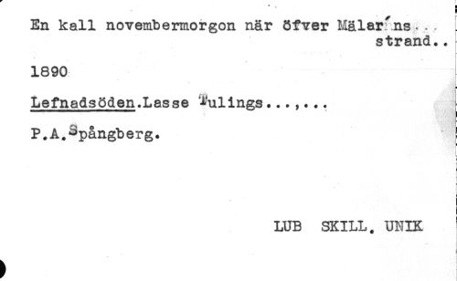 //// En kall novembermorgon när öfver Mälarfns.., [ //// strand.. ^ //// r //// 1890 //// Lefnadsöden.Lasse kulings....... //// P.A.Spångberg. //// t- //// - //// : ////