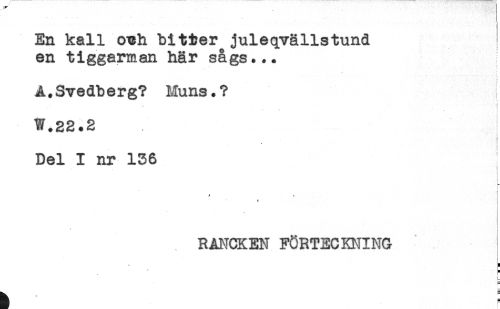 //// En kall Ceh bitter juleqvällstund //// en tiggarman här sågs... //// ! //// A.Svedberg? Muns.? //// W.22.2 //// Del I nr 136 //// RANCKEN FÖRTECKNING ' //// 'i //// t ////