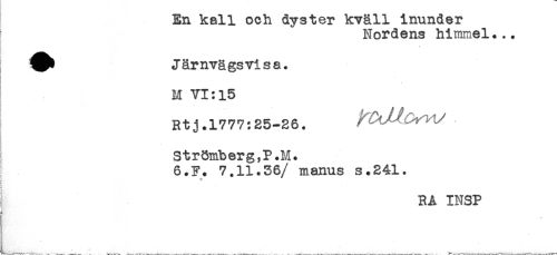 //// En kall och dyster kväll inunder //// Nordens himmel... //// * //// i //// Järnvägs visa. //// ! //// M VI: 15 //// Rtj.1777:25-26. f M //// Strömberg,P.M. //// 6.F. 7.11.36/ manus s.241. //// i //// RA INSP //// ....... ' _ ^ ^ . ^ . _____ ////
