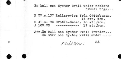 //// En kall och dyster kväll under nordens //// himmel höga... //// * - « ** //// B 35,s.137 Rallarevisa från Ofétsbanan, //// 16 str. kom. //// B 41,s. 83 Ofotän-Banan. 18 str.kom. //// A 107:73 --- ----- 17 str.kom. //// Jfr.En kall och dyster kväll inunder... //// En mörk och dyster kväll under .... ////