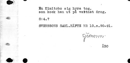 //// En Kimitobo sig hyra tog, //// som kock han ut pa vattnet drog. //// ^ 8:4.? //// n-^n?*'. ^ -* i * //// ' ---- ** * - - ----- //// ir'" ' , - //// SVENSSONS SAI,!L.HÄFTE NR 10.s.90-91. //// v'.., //// 't' --<**' //// ABO ////