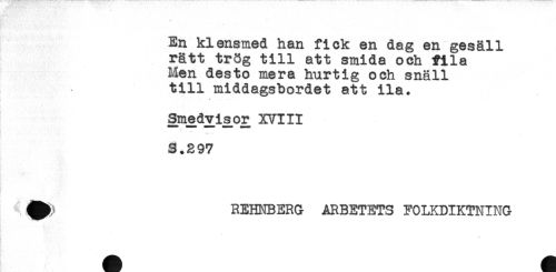 //// En klensmed han fick en dag en gesäll //// rätt trög till att smida och fila //// Men desto mera hurtig och snäll //// till middagsbordet att ila. //// Sme d v i s^or XVI 11 //// S.297 //// ^ REHNBERG ARBETETS FOLKDIKTNING //// * ////