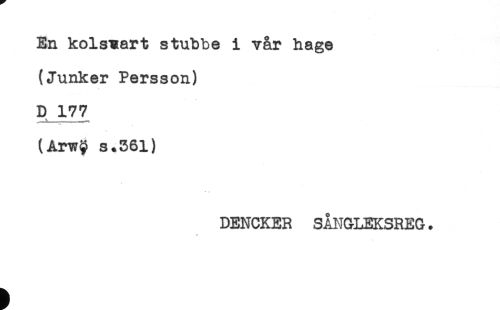 //// En kolsvart stubbe i vår hage //// (Junker Persson) //// D 177 //// . * //// (Arw$ s.361) //// * - //// DENCKER SÅNGLEKSREG. //// t ////
