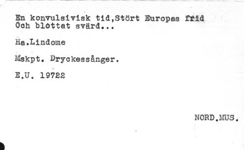 //// En konvulsivisk tid,Stört Europas frid //// Och blöttat svärd... //// -<* //// Ha.Lindome //// Mskpt. Dryckessånger. //// E.U. 19722 ////