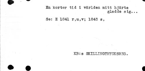 //// En korter tid i världen mitt hjärta //// gladde sig... //// * ; i //// Se: E 1641 r,u,v; 1843 s, //// . //// -* //// [ //// - //// * //// KB:s SKILLINGTRYCKSREG. ////