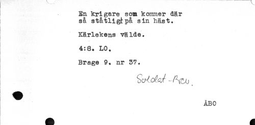 //// ! En krigare som kommer där //// så ståtligt på sin häst. //// Kärlekens välde. //// „ //// 4:8. LO. //// - //// Brage 9. nr 37. //// * //// ^ ÅBO ////