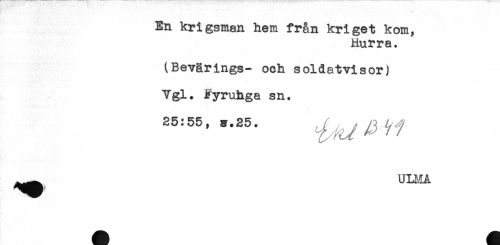 //// En krigsman hem från kriget kom, //// hurra. //// tBevärings- och soldatvisor) //// Vgl. Fyruhga sn. //// < //// 25:55, s.25. / ^/^^f //// ___ULMA ////