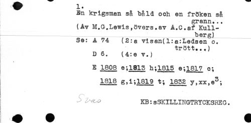 //// JL . //// En krigsman så båld och en fröken så //// grann... //// (Av M.G.Lewis,övers.av A.C.af Kull- //// berg) //// Se: A 74 (2:a visan(l:a:Ledsen o. //// trött...) //// D 6. (4:e v.) //// ' * ' ' * , //// E 1808 e;1813 h;1815 e;l817 c; //// 1818 g,i;1819 t; 1832 y,xx,e^; //// -- KB: sSKILLINGTRYCKSREG. //// < ////