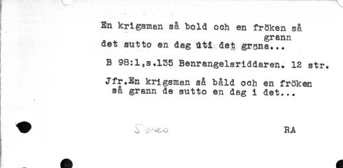 //// ! //// i En krigsman så bold och en fröken så //// ^ grann //// aet sutto en dag dti det gråna... //// B 98:l,s.l35 Benrangelsriddaren. 13 str. //// Jfr.En krigsman så båld och en fröken //// så grann de sutto en dag i det... //// < //// y RA ////