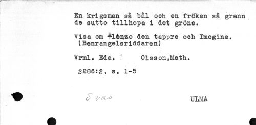 //// En krigsman så bål och en fröken så grann //// de sutto tillhopa i det gröna. //// Visa om *lénzo den tappre och Imogine. //// (Benrangelsriddaren) //// Vrml. Eda. Olsson,Math. //// 2286:2, s. 1-5 //// ^ ^^ ULMA ////